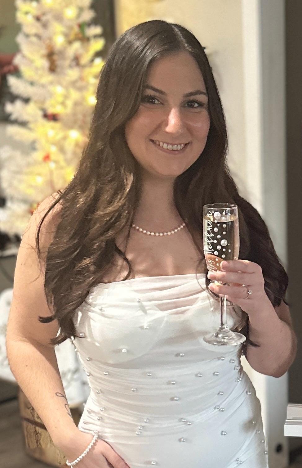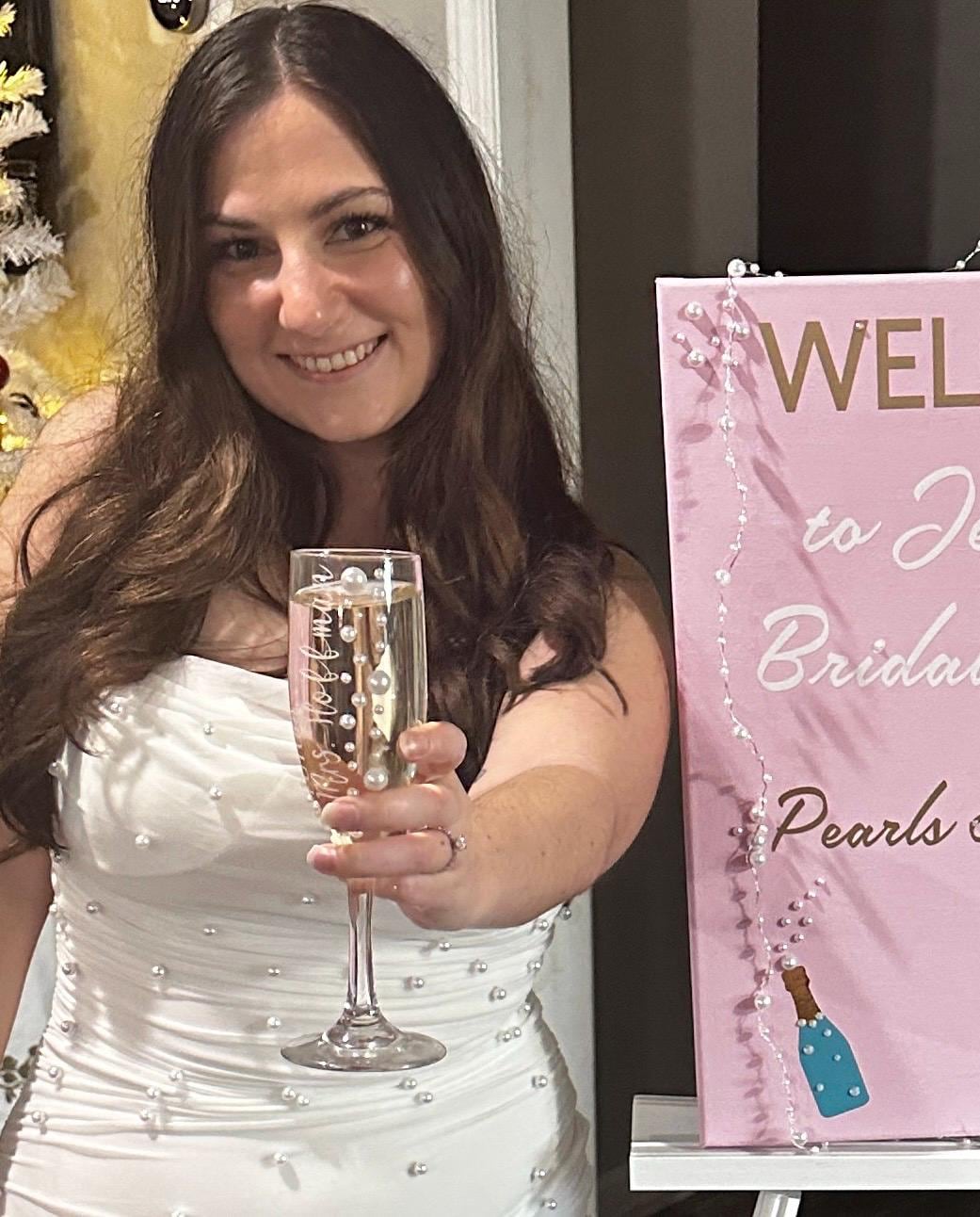 Each champagne glass is carefully customized with "Mrs" or "Future Mrs" in a graceful script, complemented by hand-placed pearl accents that add subtle shimmer and sophistication. Whether you’re surprising your best friend, sister, or yourself, these flutes are a beautiful way to mark the journey from Miss to Mrs.