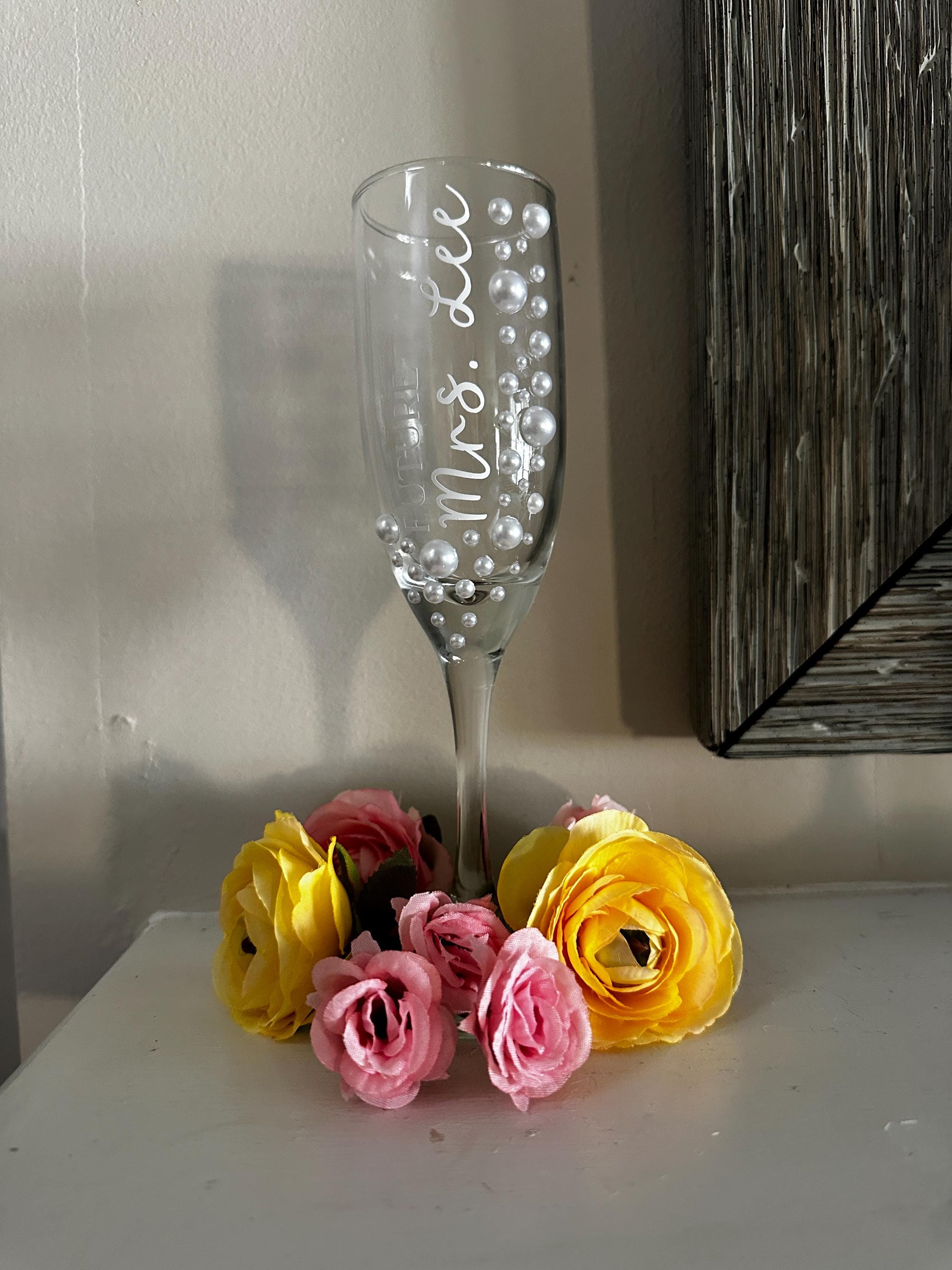 Raise a toast in unforgettable style with our Custom "Mrs" or "Future Mrs" Champagne Flutes, adorned with delicate pearls for a timeless and romantic touch. Perfect for bridal showers, engagement parties, or as a keepsake for the bride-to-be, these flutes make every sip feel like a celebration of love.