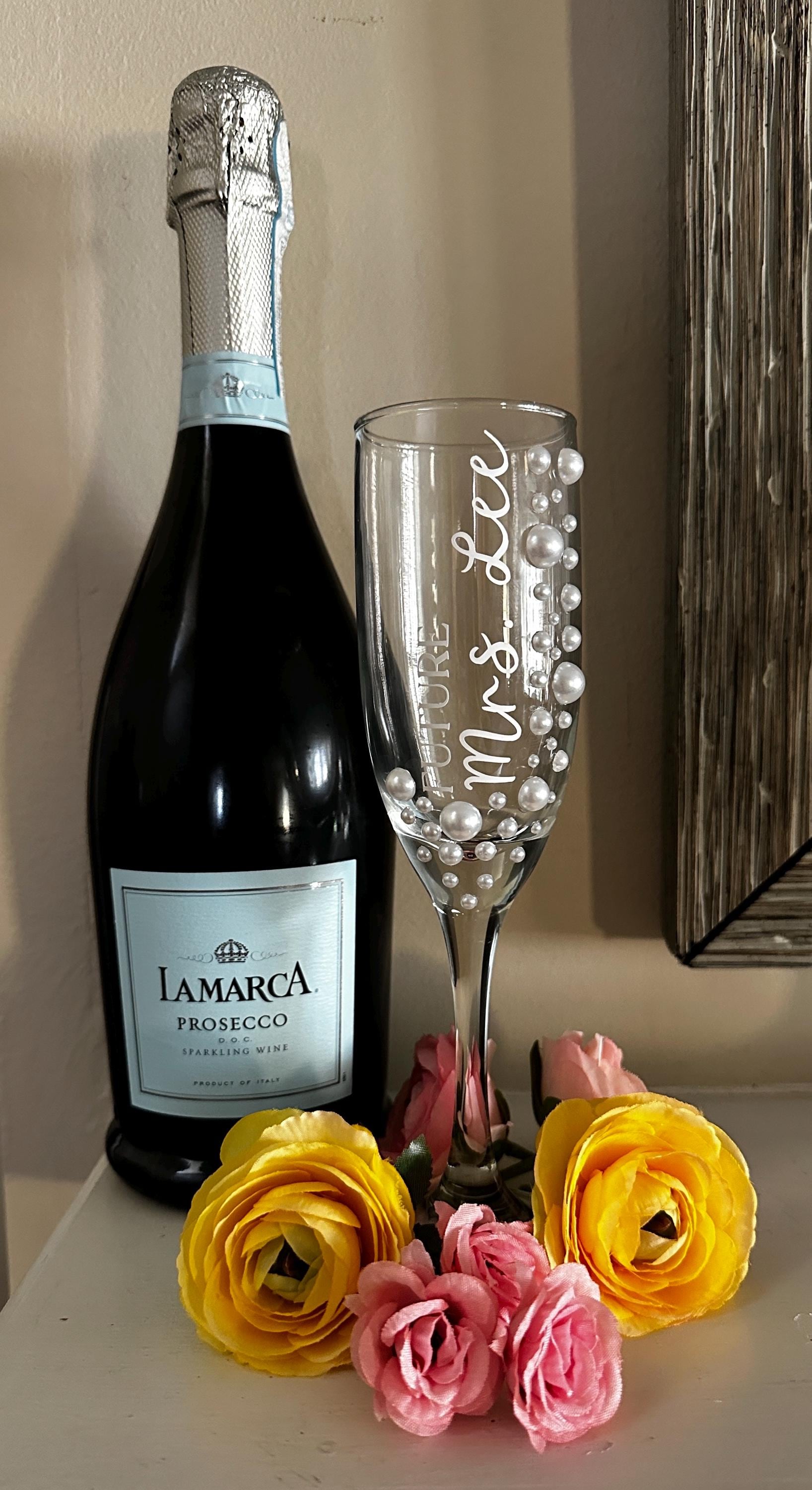 Custom”Mrs” or "Future Mrs." Champagne Flutes: Pearl Bridal Shower Gift, Pearls and Prosecco