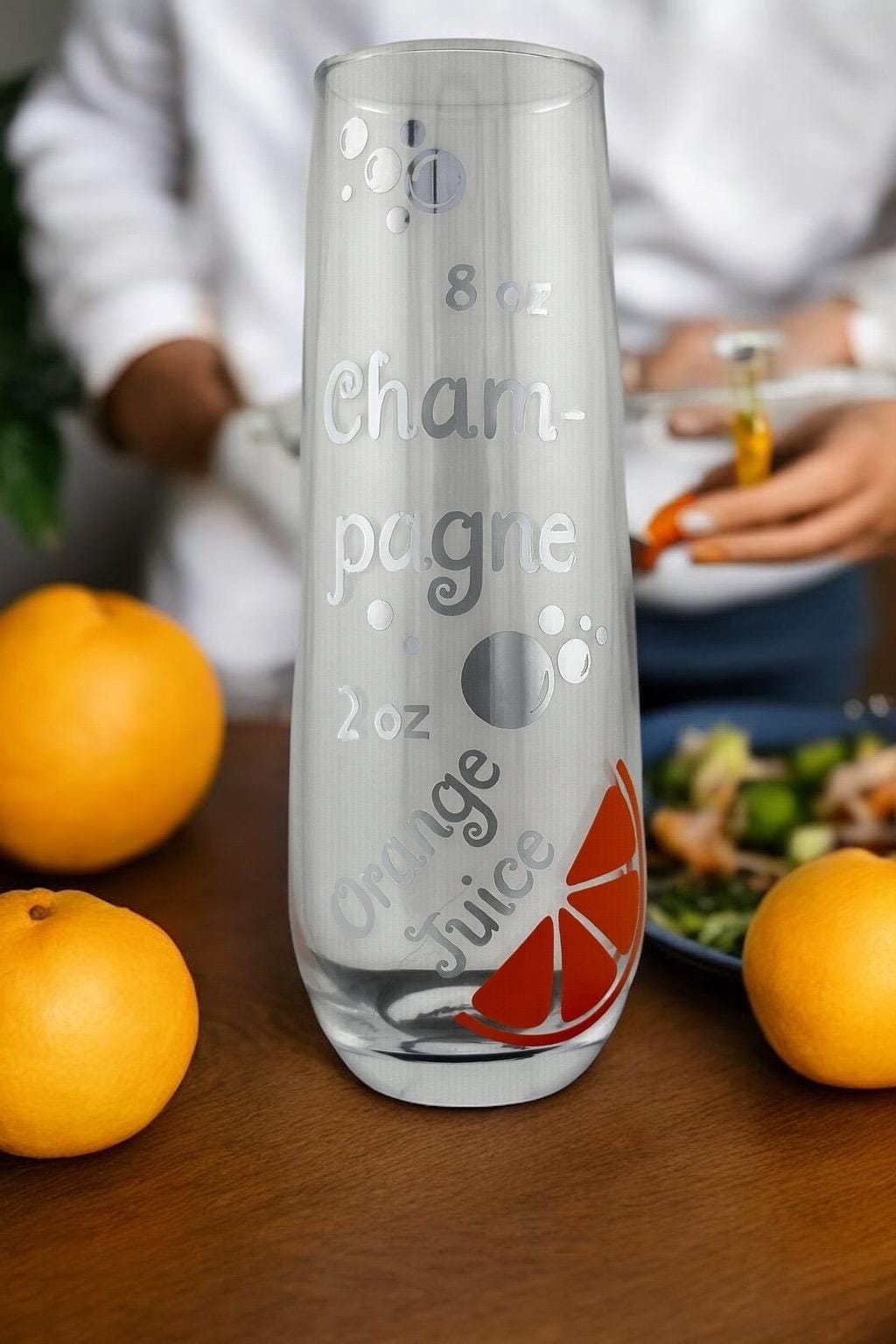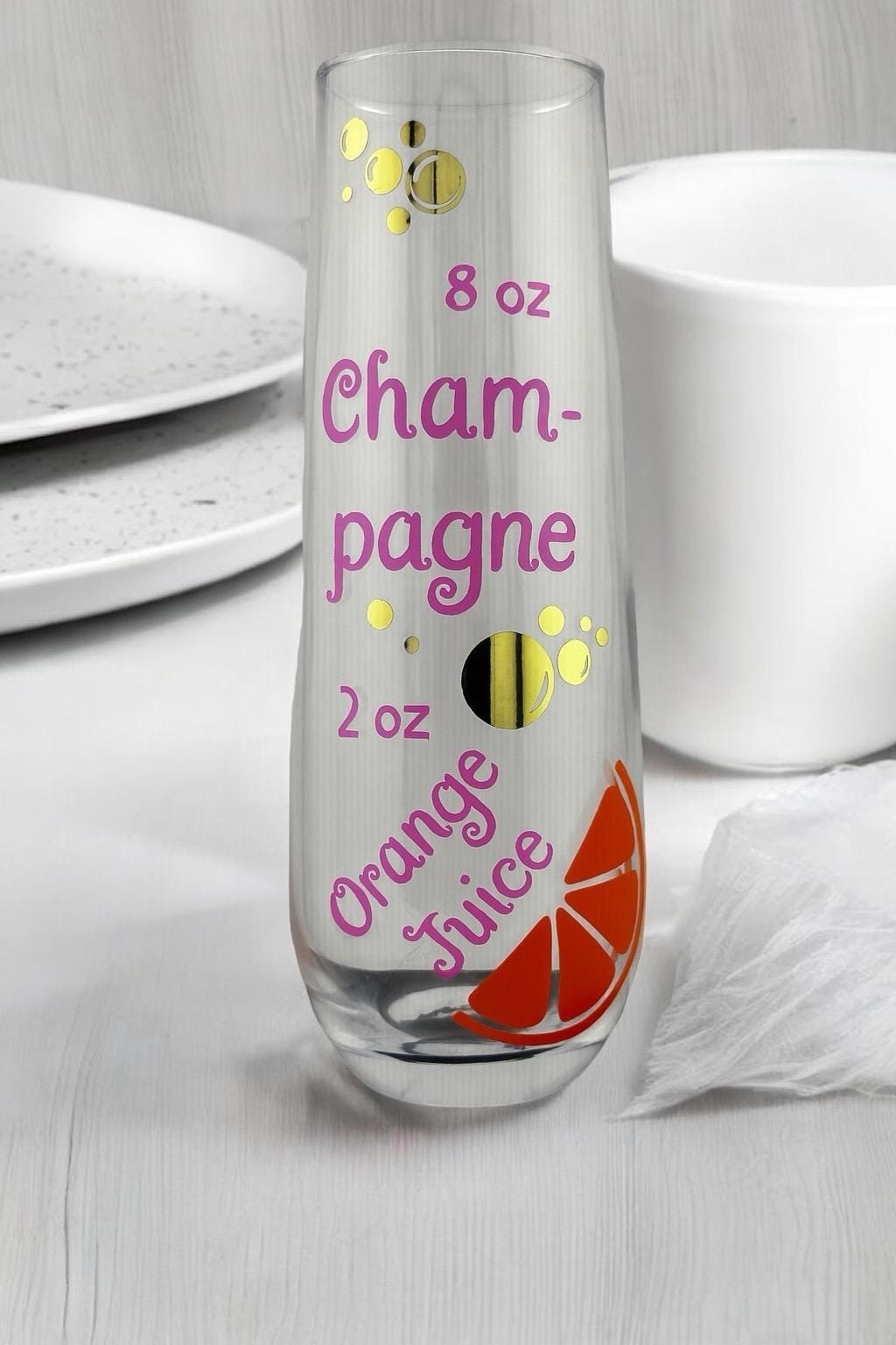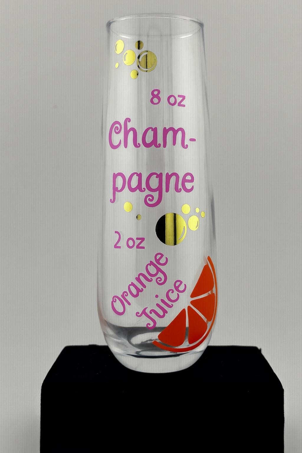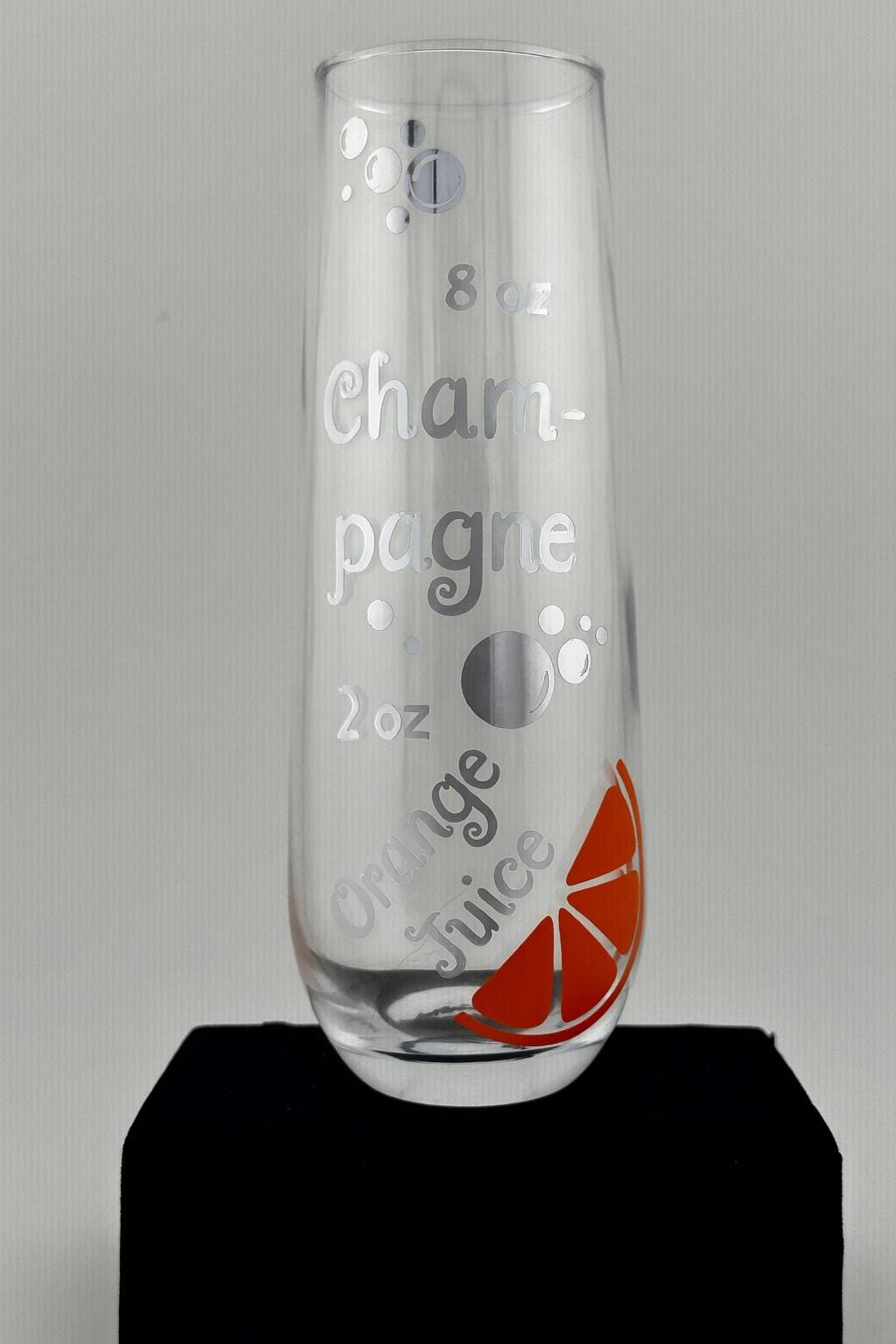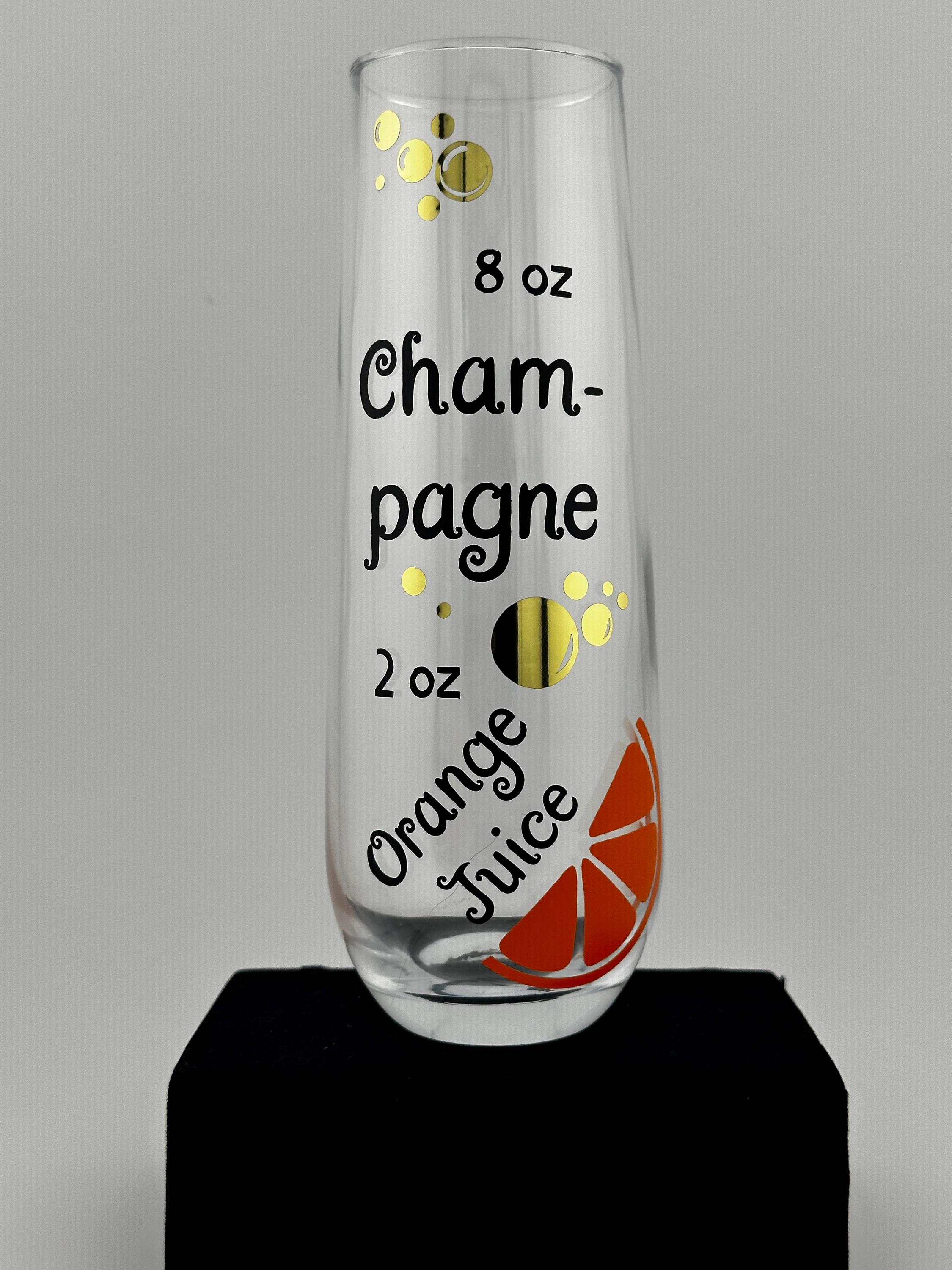 This fun Mimosa Recipe Champagne Flute features a playful mix of fun lettering, bubbles, and a bright orange slice design — a perfect reminder of the classic brunch favorite. Whether you’re toasting at a bridal shower, celebrating with friends, or giving a thoughtful gift, this glass brings charm and cheer to every occasion.