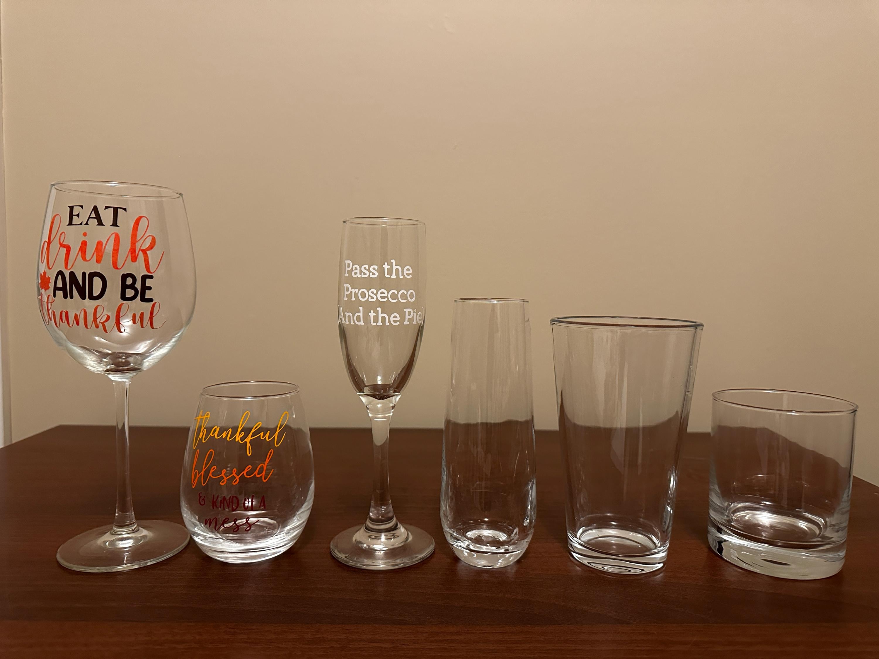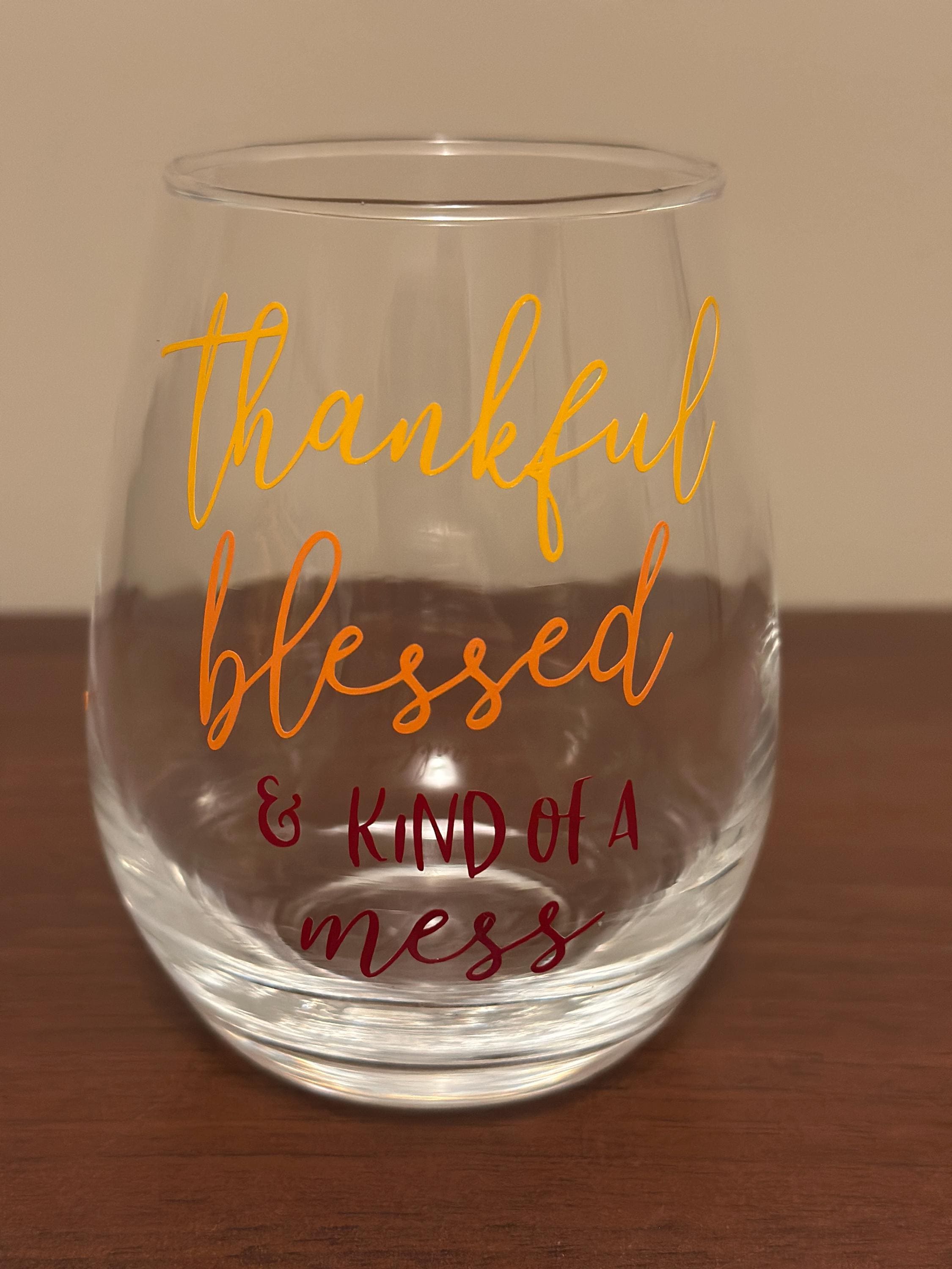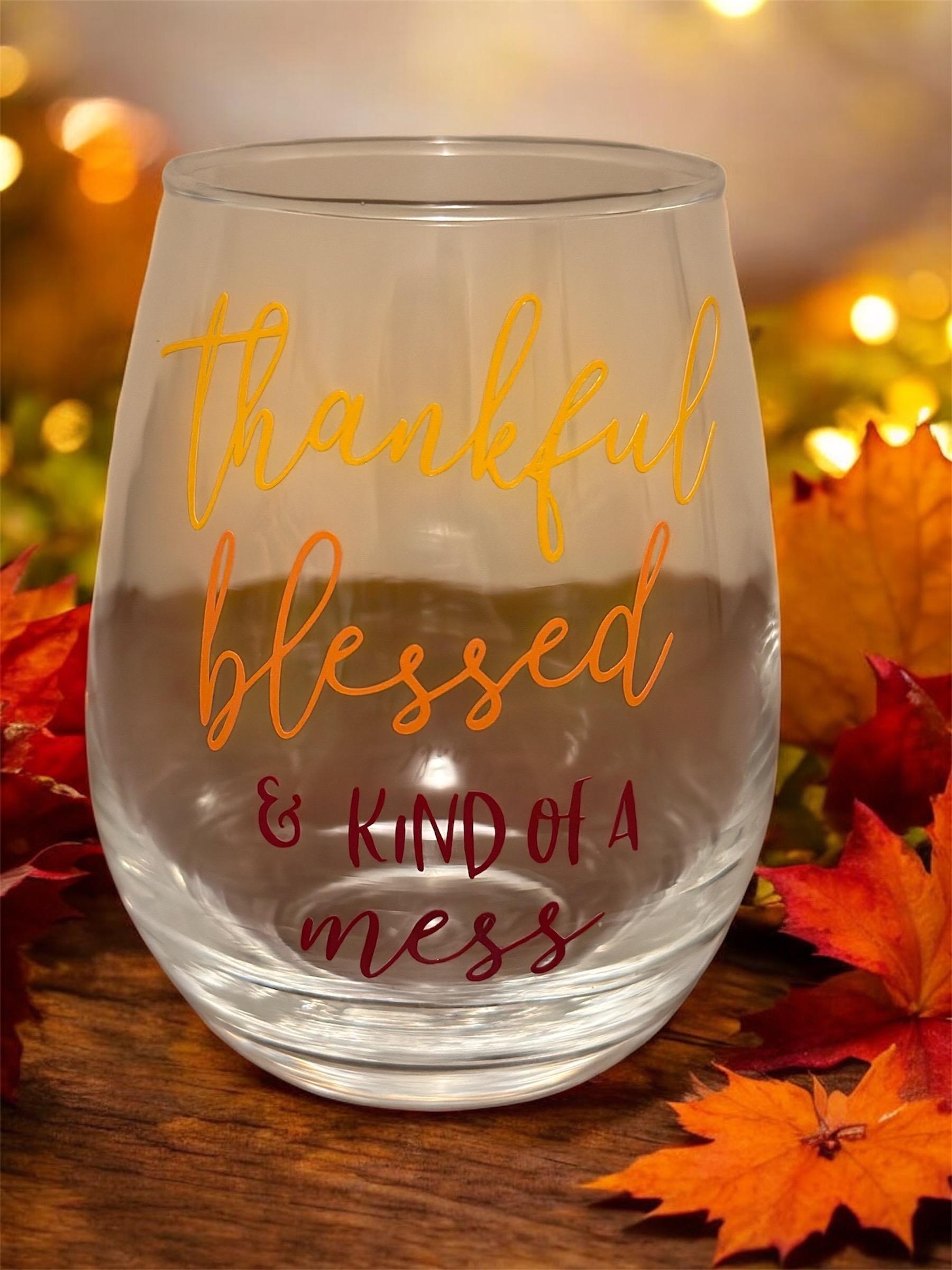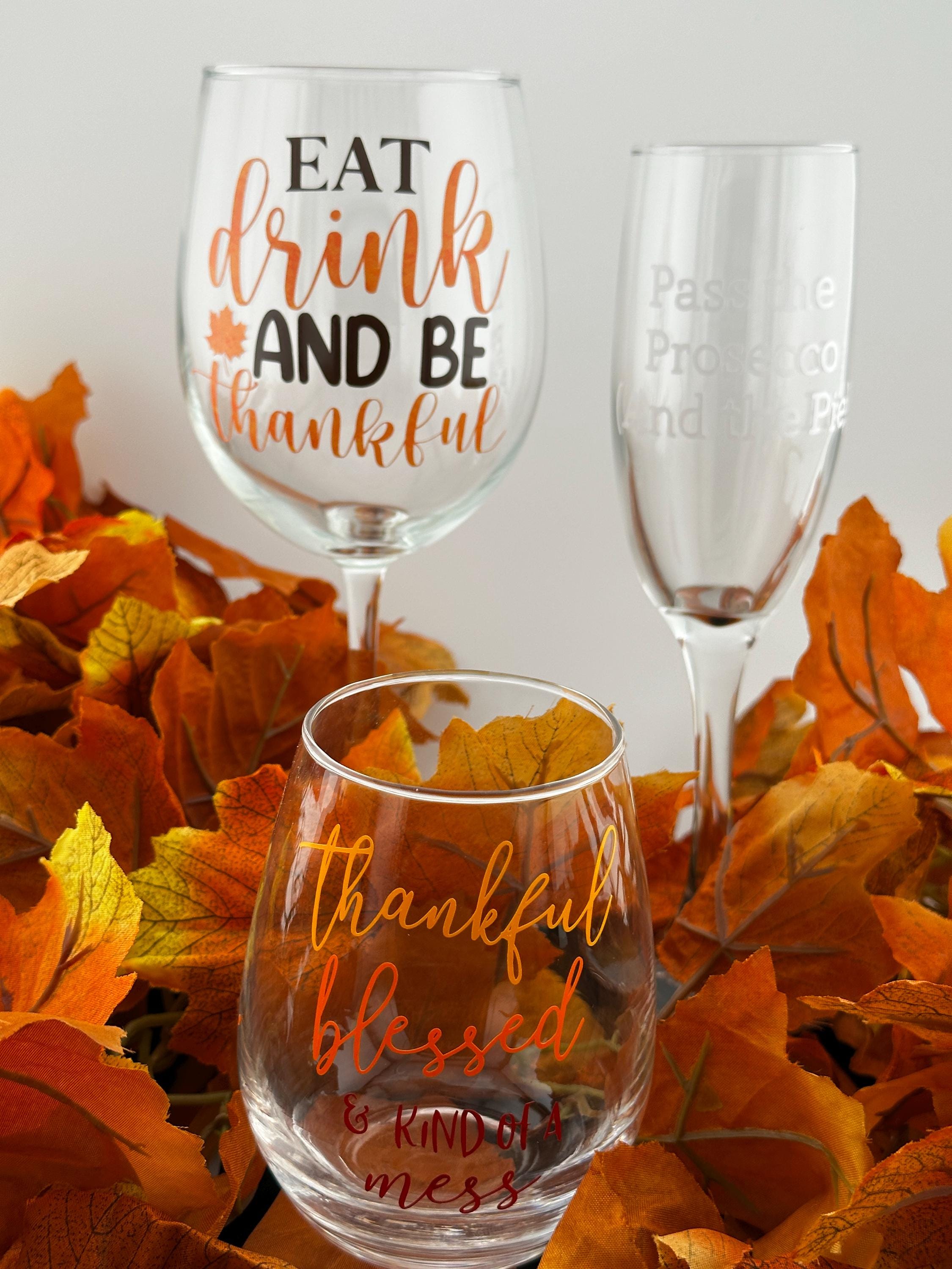 Celebrate Thanksgiving with a smile (and a sip)! This festive trio of assorted styles of wine glasses features three original designs — Eat Drink & Be Thankful, Thankful Blessed & Kind of a Mess, and Pass the Prosecco (And the Pie). Each glass is decorated by hand with autumn-inspired colors for a touch of seasonal style.