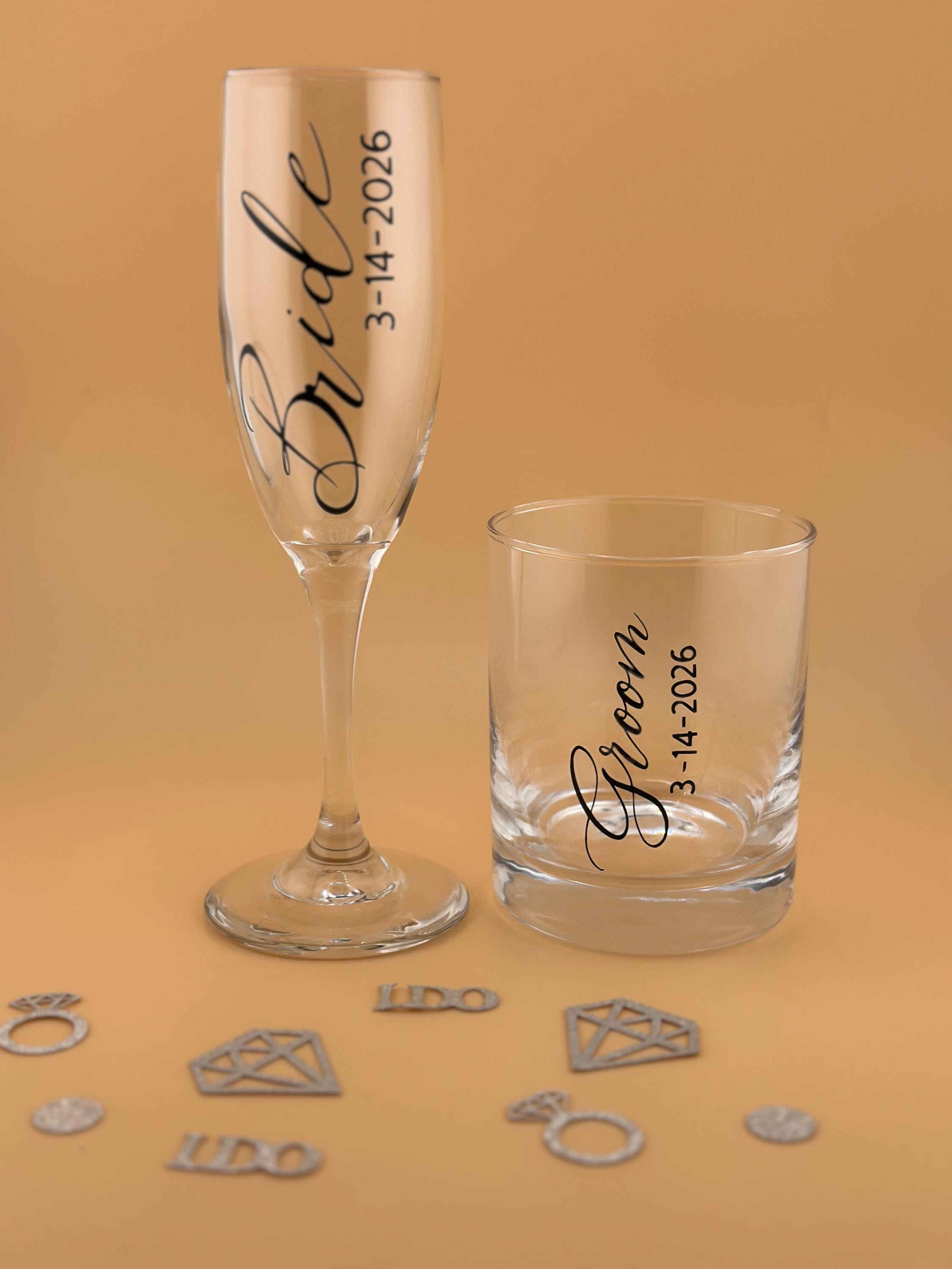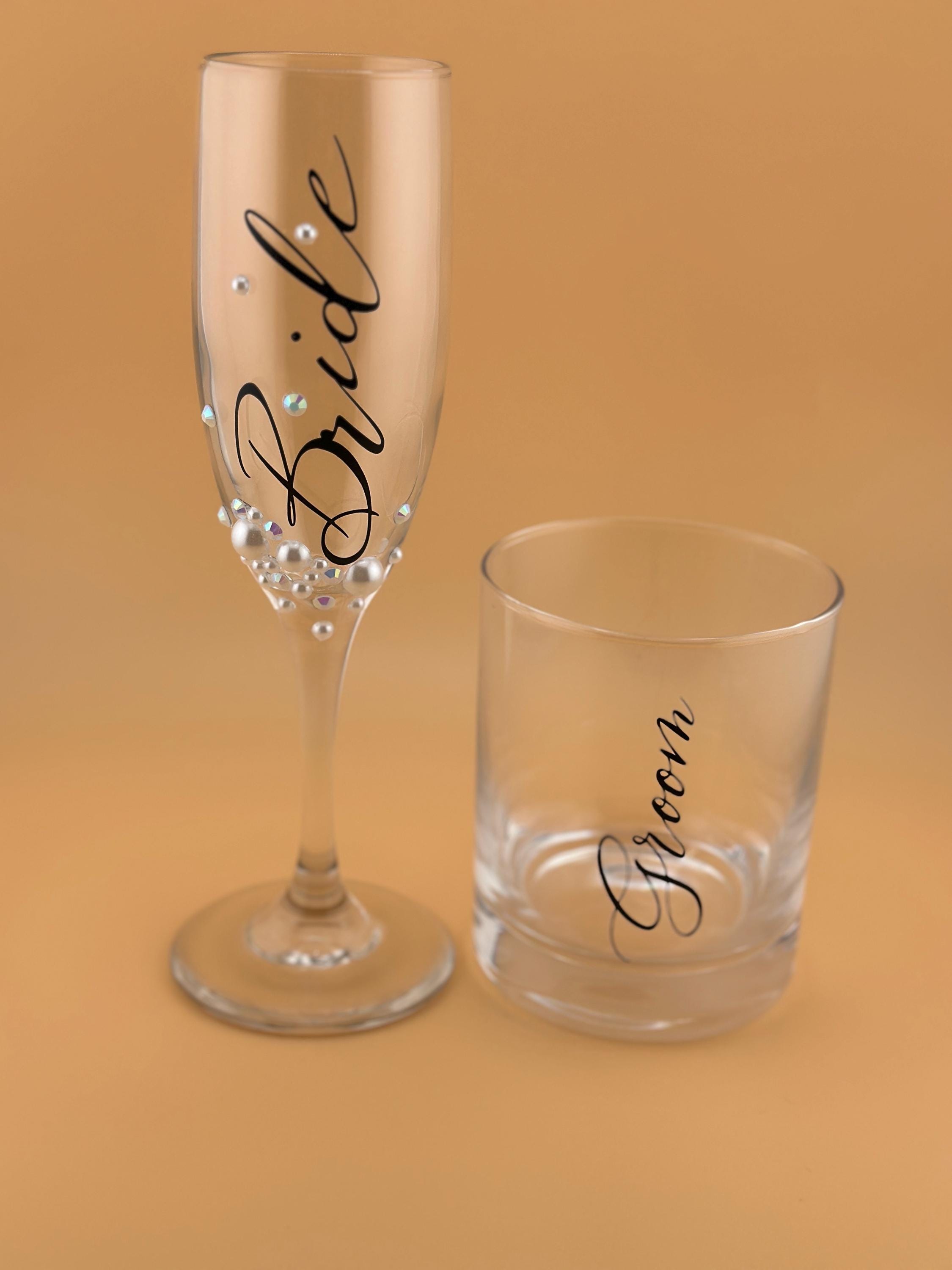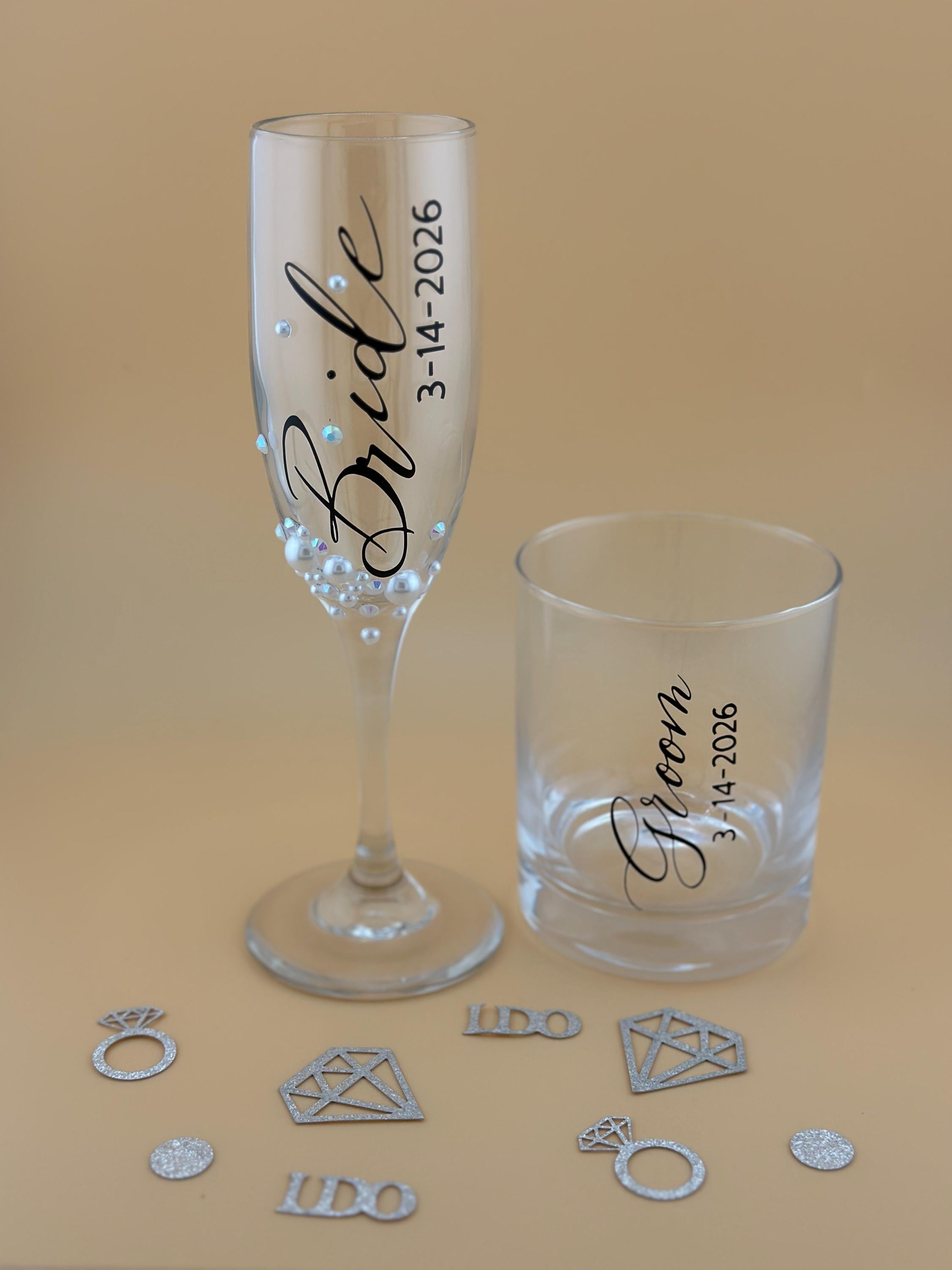 This elegant Personalized Bride Champagne Flute and Groom Whiskey Rocks Glass Set is the perfect gift for newlyweds, engagements, bridal showers, or anniversaries. Each piece is customized with your choice of name, date, or title — creating a timeless keepsake for the special couple. Available individually or as a discounted set of flute and rocks glass. Standard options include title only, title and date, title date and pearls on the flute - mix and match to create your perfect look. Want a variation that isn't shown? Custom orders are our specialty...Just message!