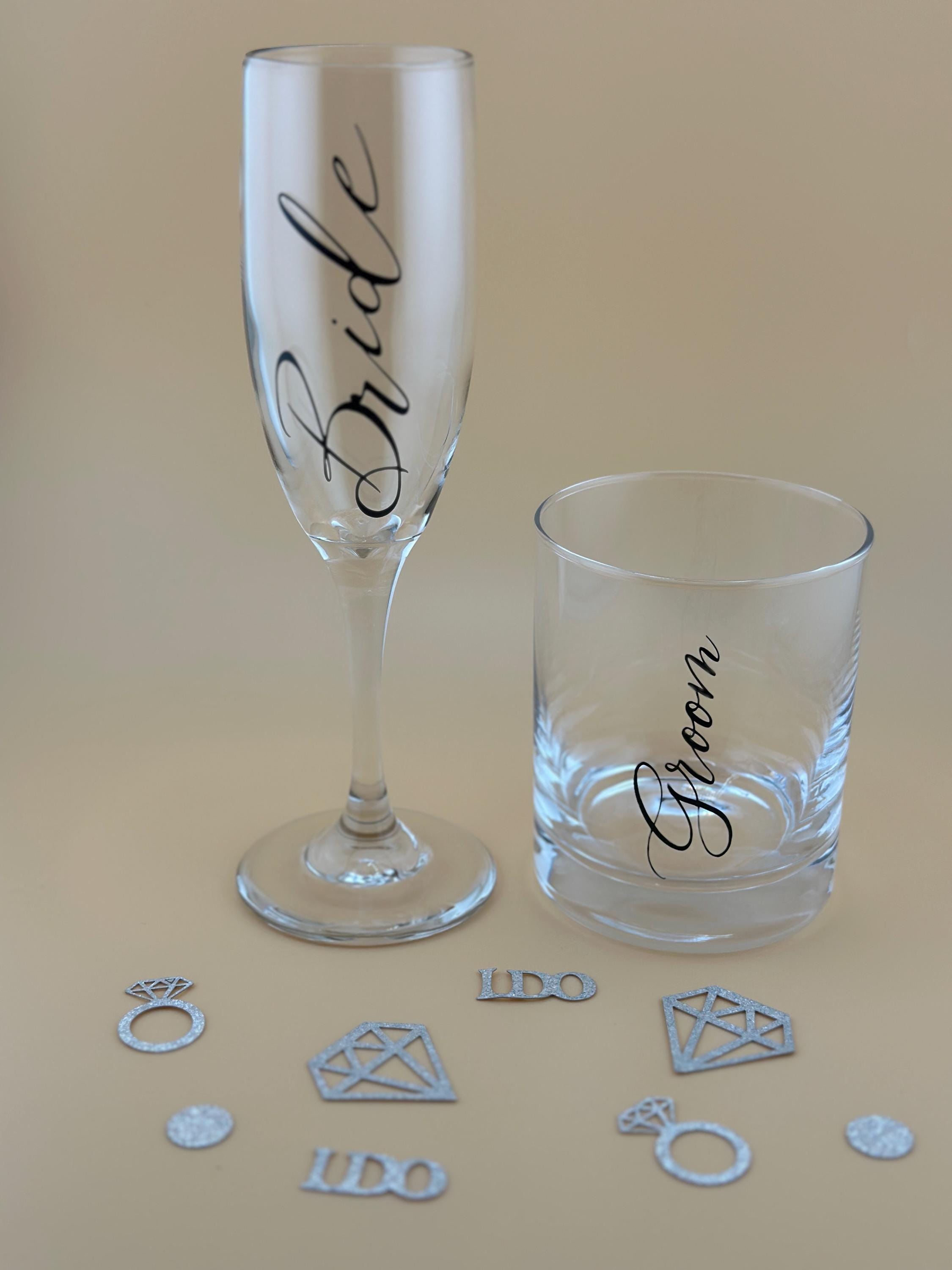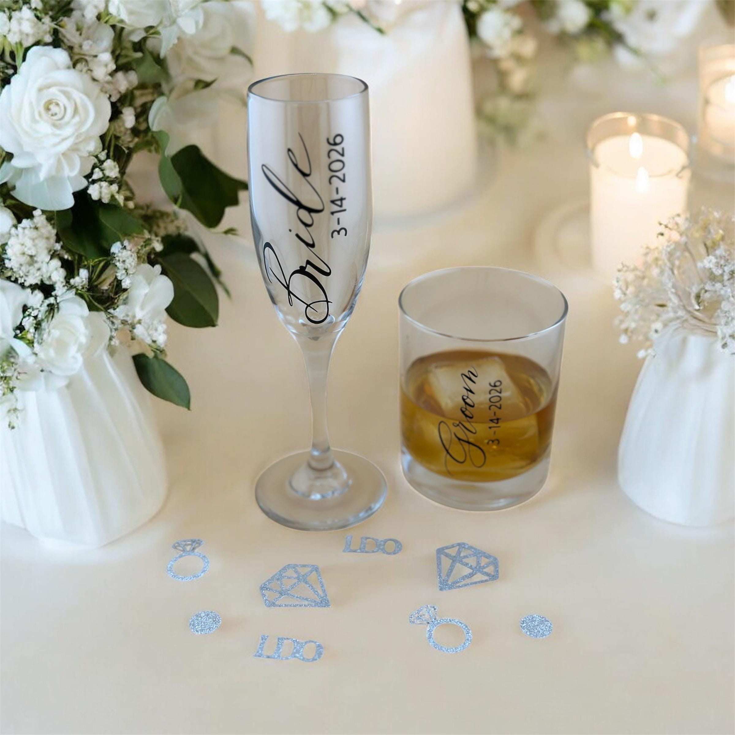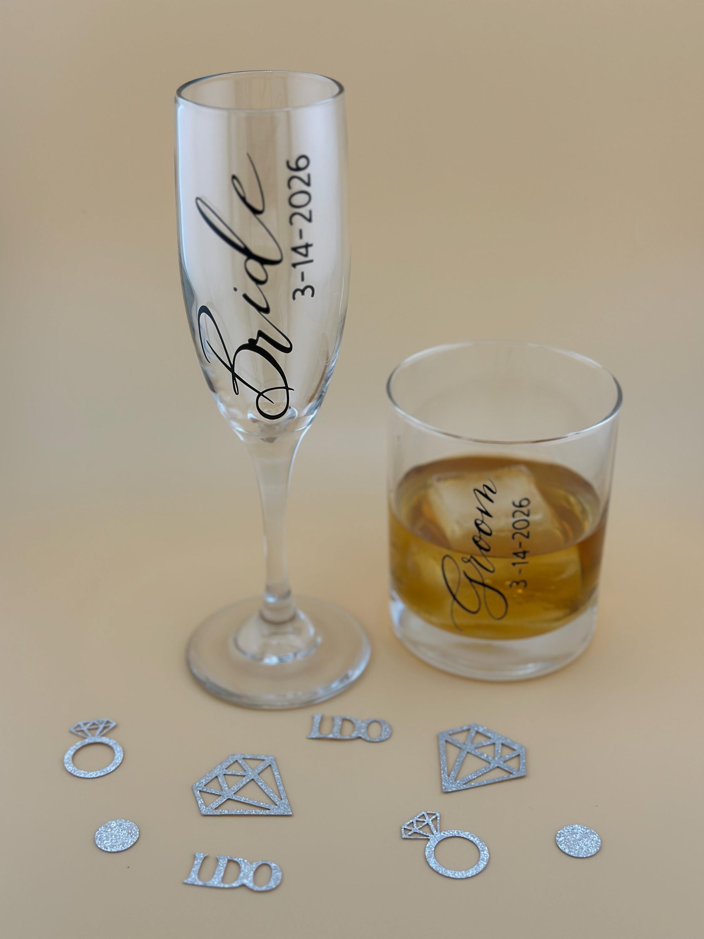 This elegant Personalized Bride Champagne Flute and Groom Whiskey Rocks Glass Set is the perfect gift for newlyweds, engagements, bridal showers, or anniversaries. Each piece is customized with your choice of name, date, or title — creating a timeless keepsake for the special couple. Available individually or as a discounted set of flute and rocks glass. Standard options include title only, title and date, title date and pearls on the flute - mix and match to create your perfect look. Want a variation that isn't shown? Custom orders are our specialty...Just message!