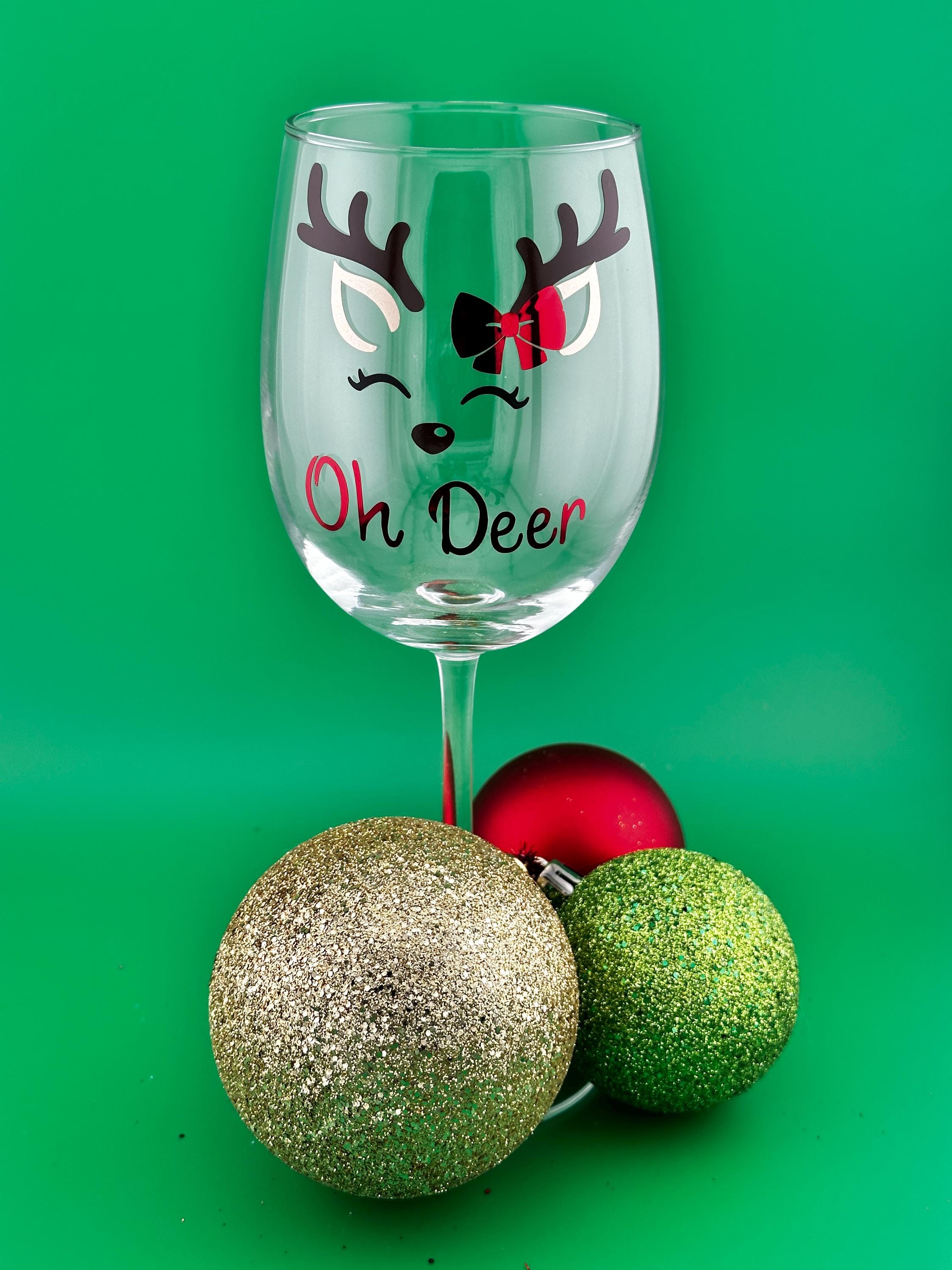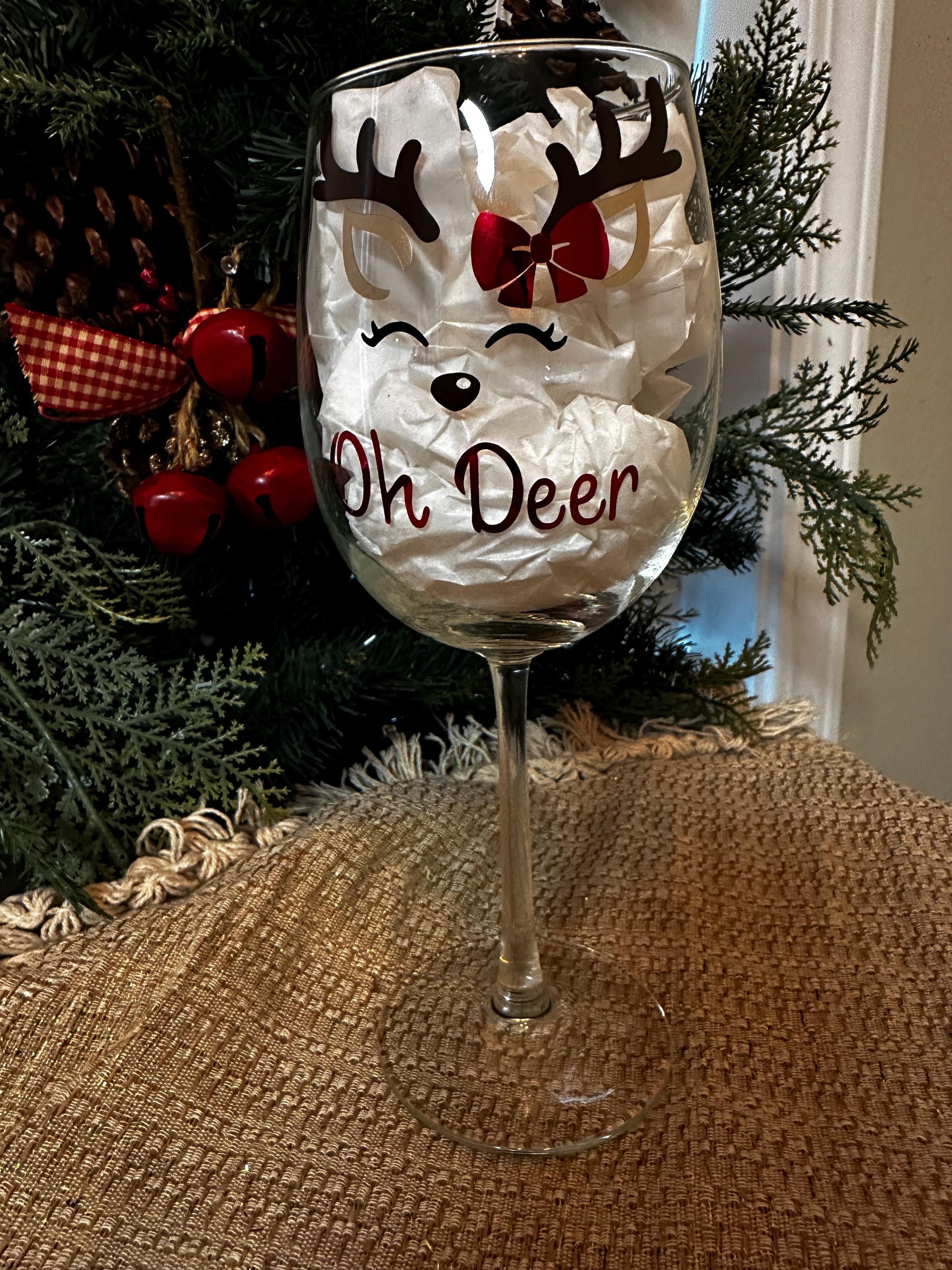 Add a touch of holiday cheer to your celebrations with this adorable “Oh Deer” Christmas wine glass! Featuring a sweet reindeer face complete with antlers, a festive bow, and playful lettering, this glass is perfect for cozy nights in, gift exchanges, holiday parties, or as a fun seasonal addition to your barware. Available in stemmed or stemless wine glass, pint glass or whiskey/rocks glass.