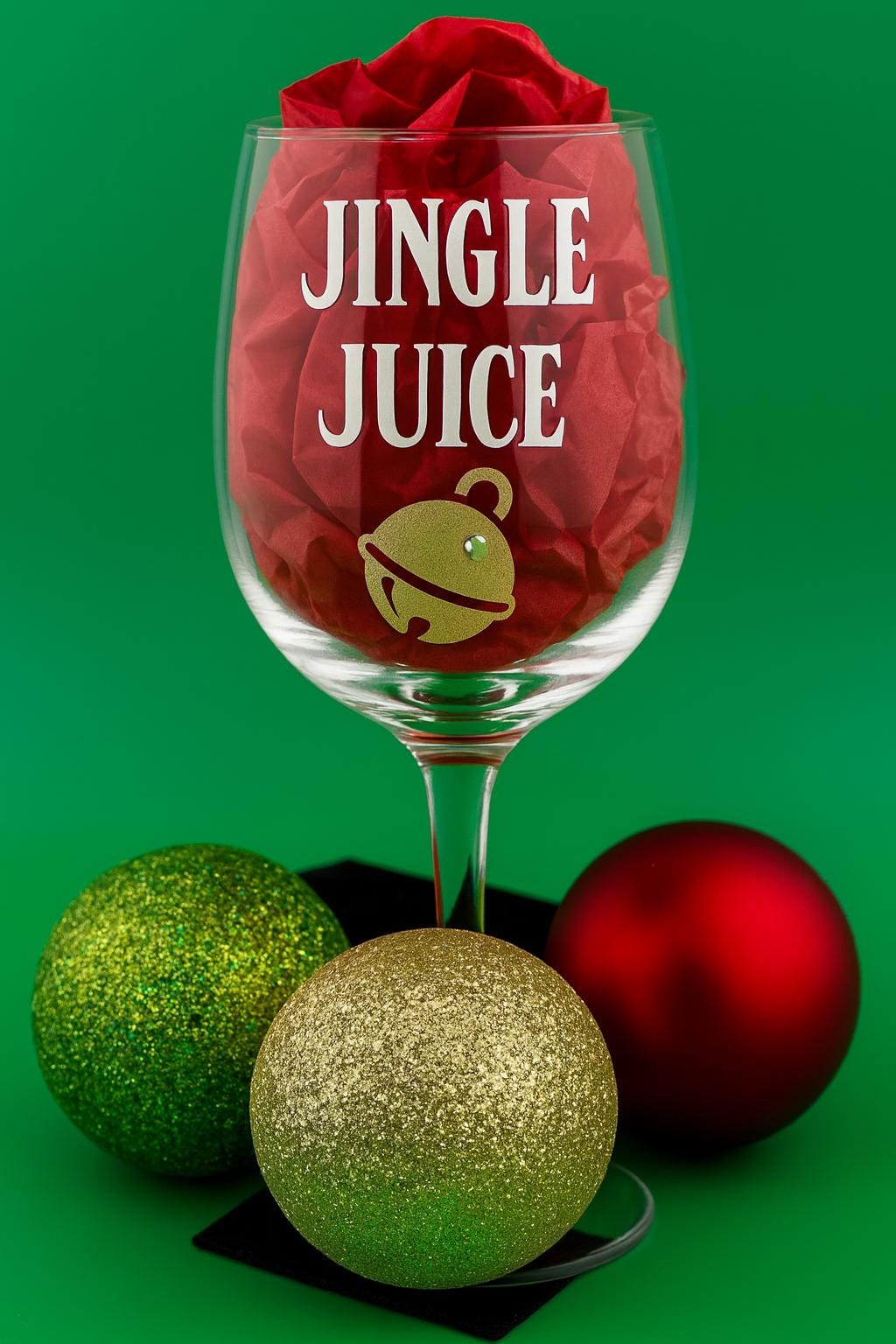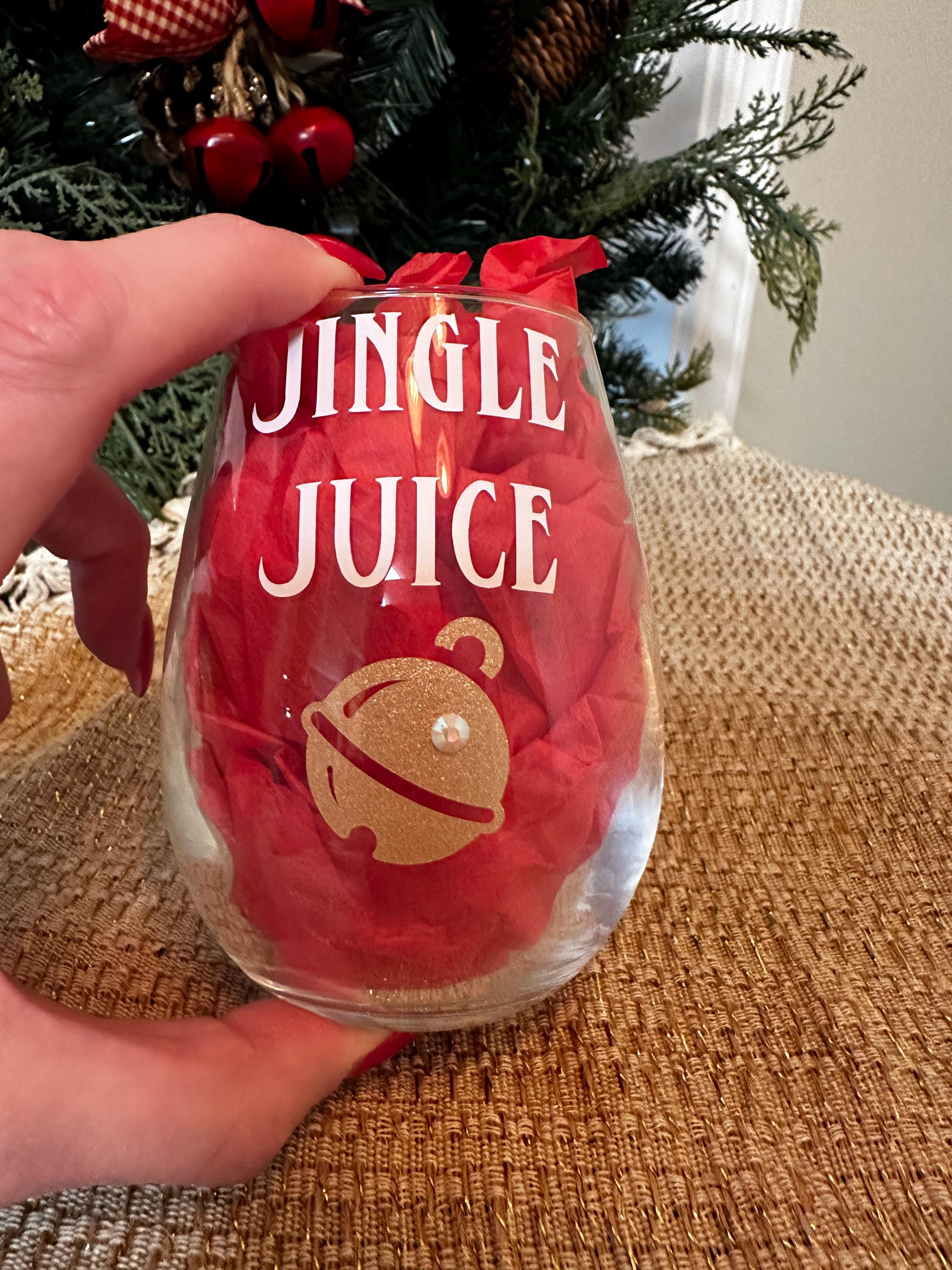 Add a touch of holiday cheer to your festivities with this adorable “Jingle Juice” wine glass! Perfect for cozy nights by the tree, festive parties, or as a fun and thoughtful Christmas gift. The glass features bold white lettering and a sparkling gold jingle bell decal that catches the light beautifully. Available in stemmed or stemless wine glass, pint glass or whiskey/rocks glass.